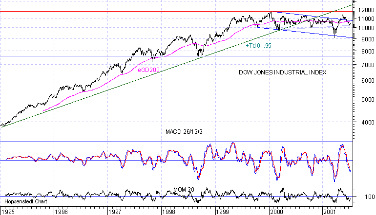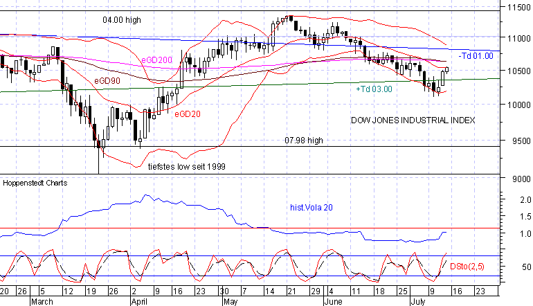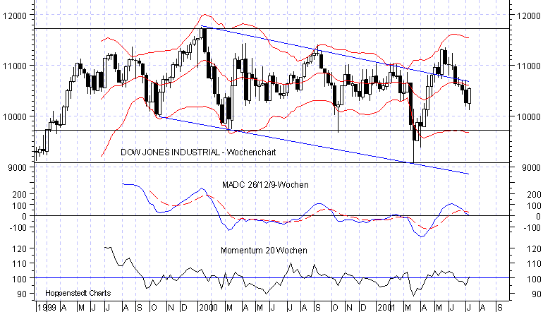 Die vergangene Woche brachte den DOW mit einer Wochenperformance von +2,8% oder 286 Punkten wieder über den wichtigen Aufwärtstrend +Td03.00 und zugleich knapp über den kurzfristigen Abwärtstrend seit dem Hoch vom 06.06.01. Zuvor markierte der Index am Mittwoch jedoch mit 10.105 noch das bisherige Verlaufstief dieser kurzfristigen Abwärtsbewegung.