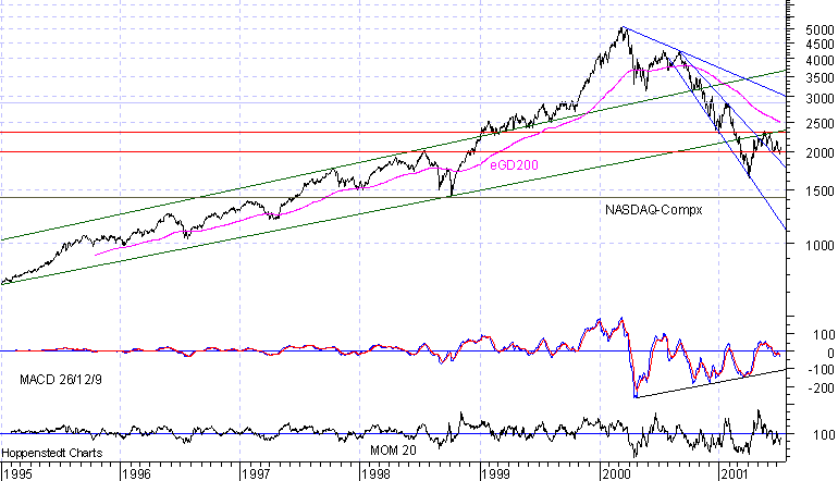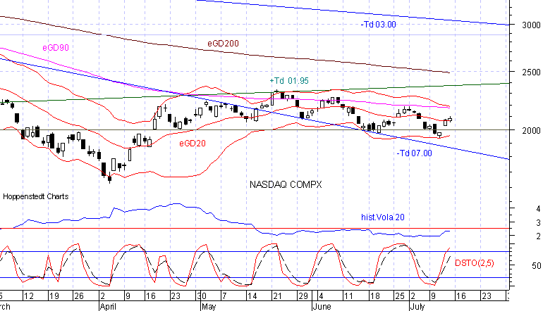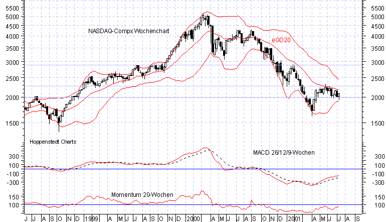 Allgemein gesehen bewegt sich der Compx weiterhin zwischen den bedeutenden Trendlinien des langfristigen Aufwärtstrends von Januar 1995 (akt. ~2.370) sowie des mittelfristigen Abwärtstrends seit Juli 2000 bei aktuell 1860 Punkten.